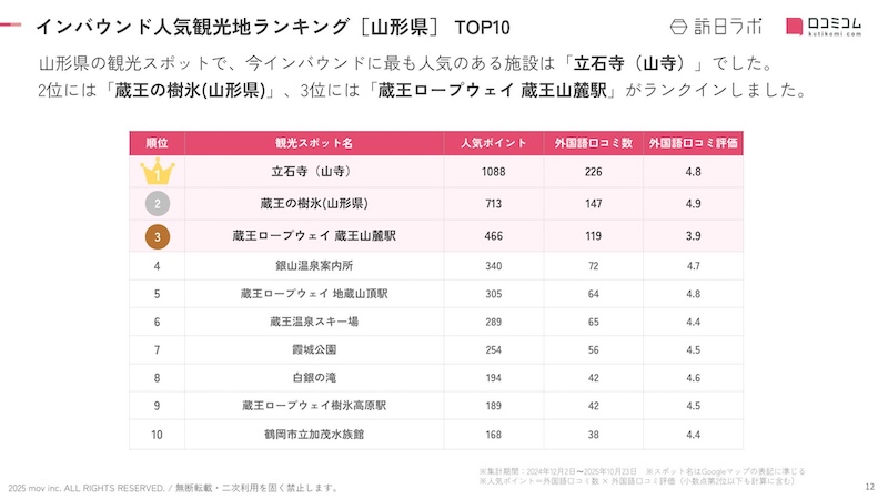 業界最大級のインバウンドビジネスメディア「訪日ラボ」及び 店舗向け集客一元化プラットフォーム「口コミコム」を運営する株式会社movは、山形の観光地に寄せられた最新の口コミデータから、独自の『インバウンド人気観光地ランキング』を発表しました。