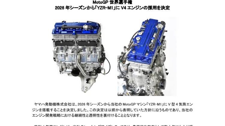 ヤマハ発動機株式会社は、2026年シーズンから当社のMotoGPマシン「YZR-M1」にV型4気筒エンジンを搭載することを決定しました。この決定は以前から表明していた方針に沿うものであり、当社のエンジン開発戦略における継続性と透明性を裏付けることとなります。