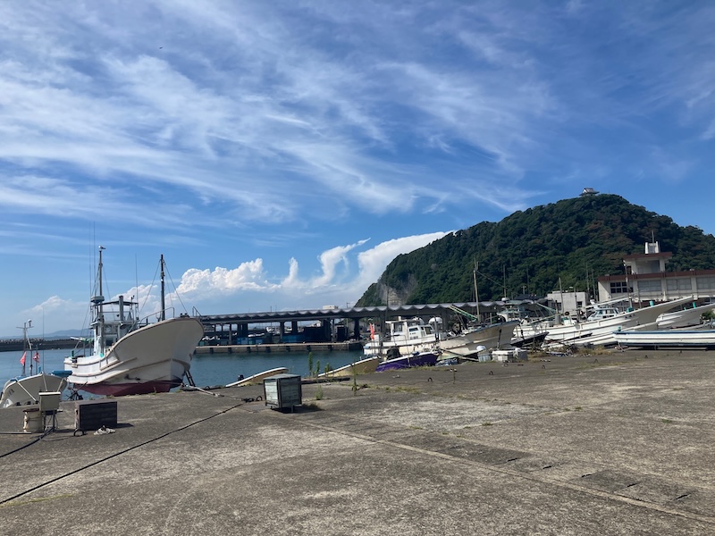 さて、そんな大山千枚田の近くを通りつつ、桜や水仙の名所の佐久間ダム湖畔の公園を通り、岩井袋に着。リゾートタウン化が進む岩井袋ですが、漁港の方は港町らしい風情があり、磯の先の西ヶ崎からは洋上に浮かぶ浮島の好眺望を望むことができます。原岡海岸の桟橋とはまた違うが、洋上の風景美を味わえます。