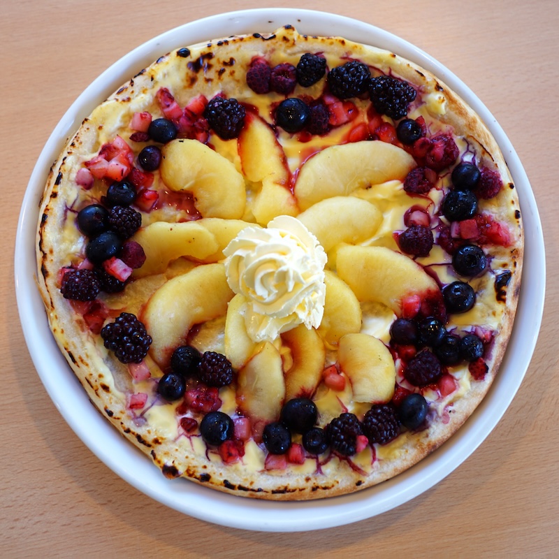 カスタードベースの記事に、禁断の果実(りんご)とベリーフルーツ各種を盛り込み盛り込み焼き上げた、”もりのまじょ”特製ピザ。