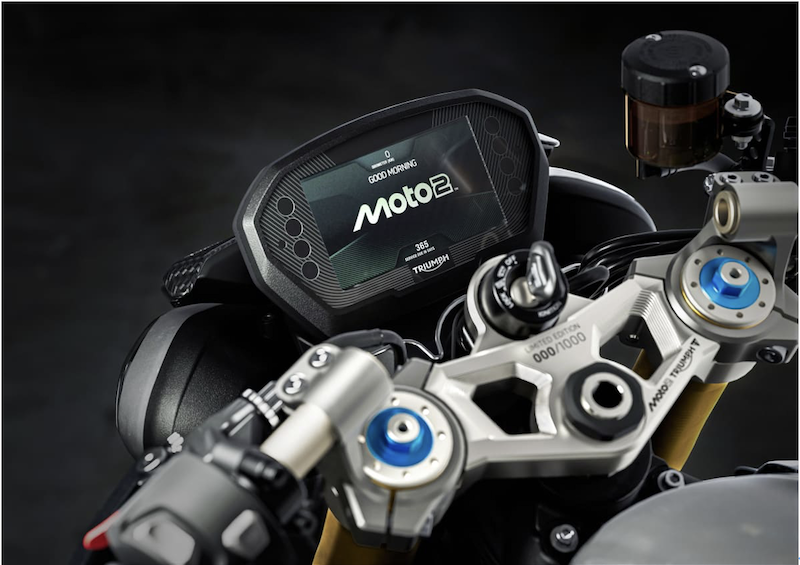両モデルにはライダーの安心感とコントロール性を高める先進のライダー支援テクノロジーが搭載されています。直感的に操作できるインターフェースと上質なスイッチギアを備え鮮明な、5インチTFTディスプレイを搭載。Moto2™Editionでは、レースのDNAを象徴する専用スタートアップ画面と限定モデルであることを示すシリアルナンバー入りビレット削り出しトップヨーク が組み合わされ、特別感をより一層強調しています。