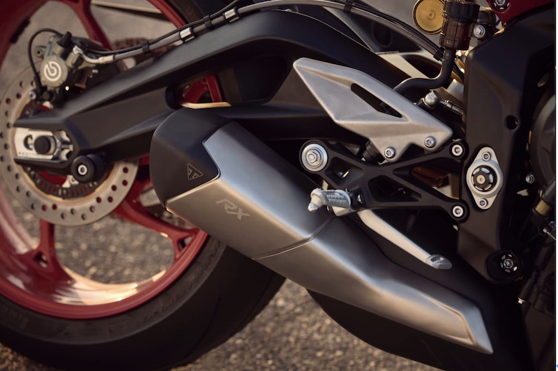 RXには、特別仕様ならではのこだわりが随所に盛り込まれています。精密な機械加工が施されたアッパーヨーク、サイレンサーにレーザー刻印された RXロゴ、そして専用の RXロゴ入りシート など、細部まで特別感のある仕上がりです。外装は印象的な マットアルミニウムシルバー を採用し、大胆な ディアブロレッド のリアサブフレームとホイールを組み合わせることで、サーキット由来のダイナミックで存在感あるスタイリングを実現しています。この特徴的なカラーリングは、初代 Street Triple 675 RXへのオマージュでもあり、そのアイコニックなレガシーを現代的に受け継ぐデザインとなっています。