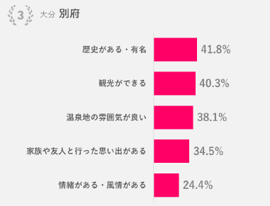 3位は「別府」。60代と70代以上で3位だった。(50代の3位は「伊香保」)。好きな理由の1位は「歴史がある・有名」、2位は「観光ができる」、3位は「温泉地の雰囲気が良い」。