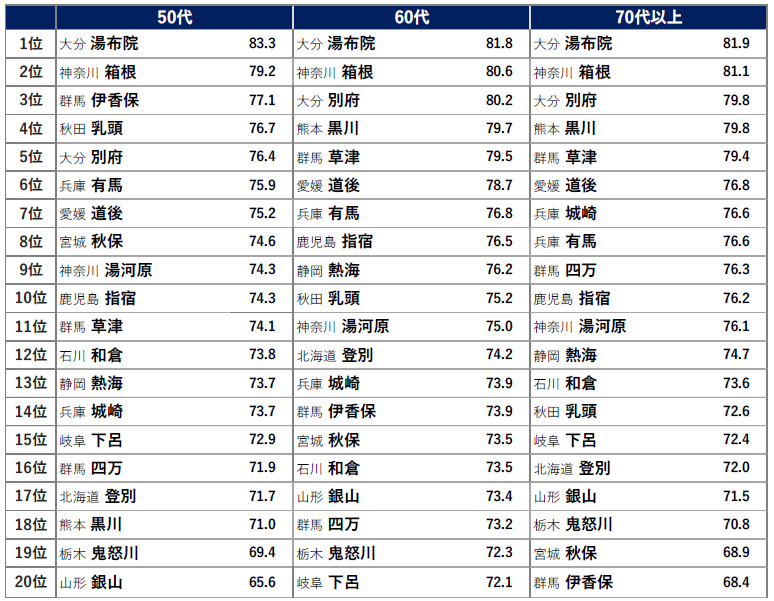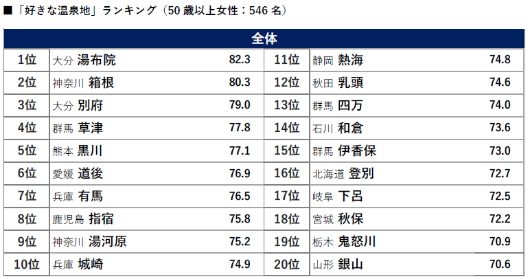 50代以上女性の96.4%が「好きな温泉地がある」と回答。旅慣れした平均年齢64.9歳の彼女たちが選んだのは、街としての総合力が高い“王道の名湯”で、1位は湯布院、2位は箱根、3位は別府という結果でした。