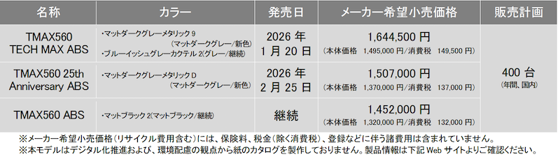 ヤマハ発動機販売株式会社は、オートマチックスポーツ「TMAX」の誕生25周年を記念した「TMAX560 25th Anniversary ABS」を2026年2月25日に発売します。「TMAX560 25th Anniversary ABS」は、「TMAX560 ABS」をベースに2005 年発売の「TMAX SPECIAL」をイメージさせるカラーリングと特別装備により、フラッグシップにふさわしい所有感を高める仕様となっています。