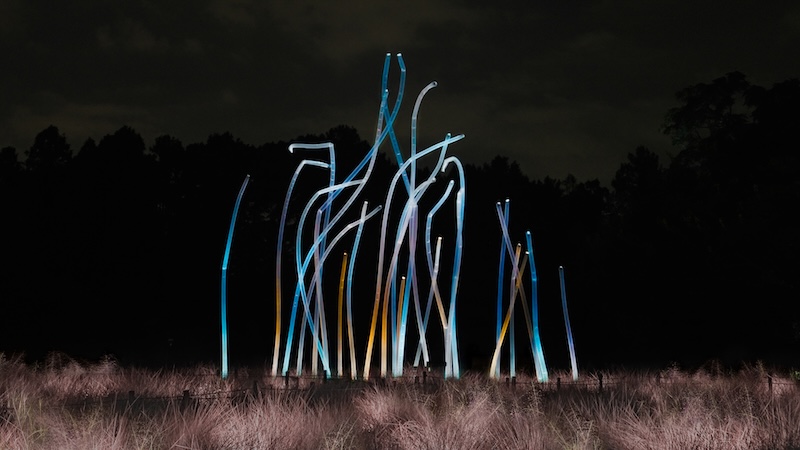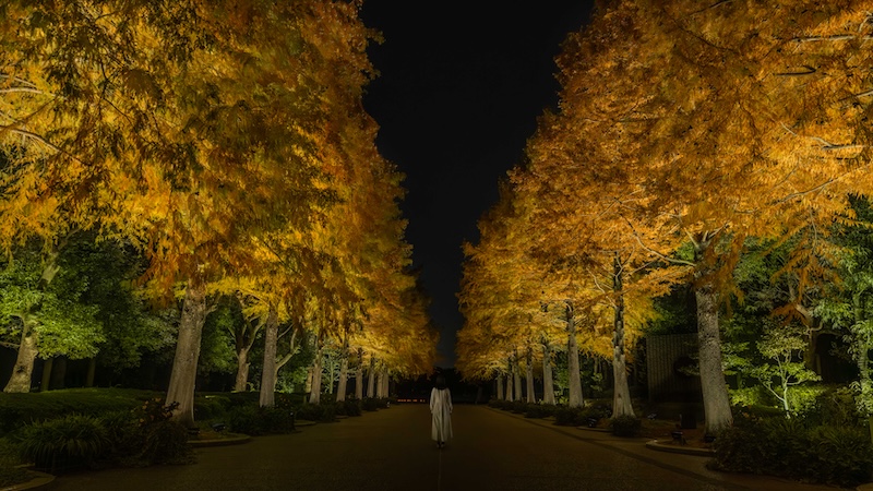 人々や動物が近くを通ると光を輝かせ、音色を響かせ、その周辺の木々も次々に呼応していく作品《呼応する木々 – フウ》は、紅葉したフウの木々に合わせた色で輝きます。《ラクウショウ並木》の木々は、秋の色に色づいています。