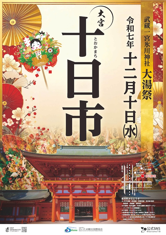 毎年12月10日に武蔵一宮氷川神社で開催される十日市は、氷川神社の神事「大湯祭(だいとうさい)」に合わせて行われる熊手市です。また、毎年12月12日に調神社で開催される十二日まちは、新年の福迎えとして行われる大歳の市です。どちらの「市」も、会場には縁起物の熊手や食べ物などを商う露店が多数出店します。是非ご来場ください。
