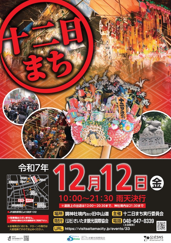 - 会場調神社境内及び旧中山道周辺(浦和区岸町)(アクセス:JR「浦和駅」西口から徒歩10分)※調神社まで※イベント専用駐車場のご用意はありません。来場の際は公共の交通機関をご利用ください。
