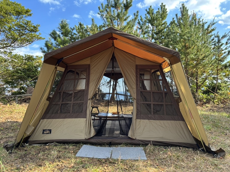 展示されている神割崎キャンプ場だと目の前に広がる海をテントの中から見ることができるため、ロケーションとの相性もすごく良いテントです。