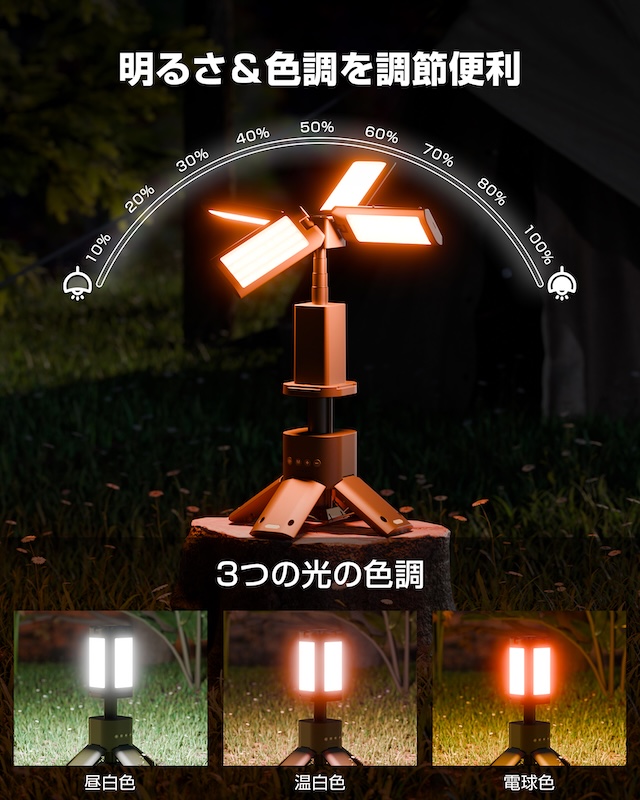 キャンプサイト全体や広い室内でも、1台で十分な光量を提供します。