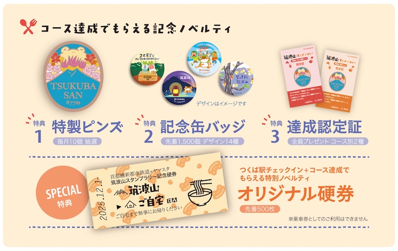スタンプラリーを達成すると、先着や抽選でオリジナル特典がもらえます。さらに、スペシャルチェックインポイントでスタンプを獲得して条件を満たすと、人気ノベルティの「オリジナル硬券」をプレゼント! 筑波山の思い出と一緒に、ぜひお持ちカエリください。