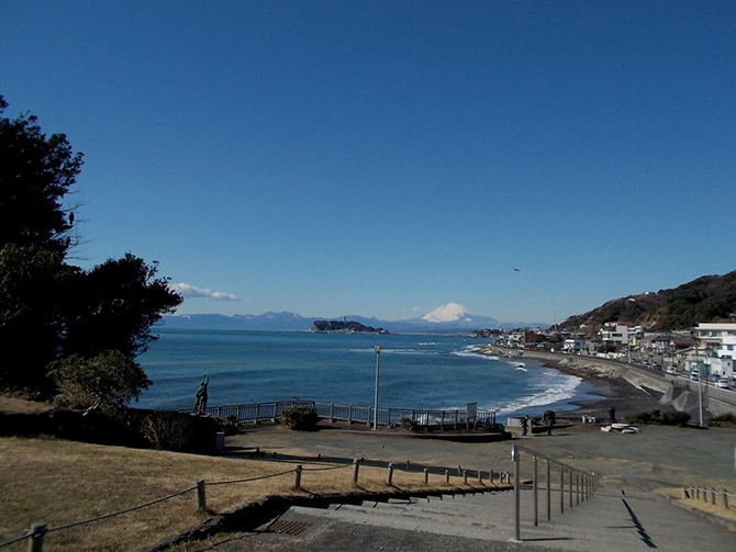 鎌倉市の海岸沿いに位置する「稲村ガ崎」は、富士山と江の島を相模湾越しに望む絶景スポットです。晴天時には伊豆大島や伊豆の山々まで見渡すことができます。夕刻の「稲村ヶ崎公園」からは、青空から夕焼けのあかね色、そして群青色へと刻々と表情が変わっていく様が見られ、背景に富士山のシルエットが浮かぶ光景は圧巻の眺めです。