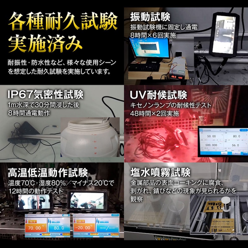 振動試験・IP67気密性試験・UV耐候試験・高温低温動作試験・塩水噴霧試験を実施し、様々な使用シーンを想定した耐久試験すべてにクリアした製品を提供していいます。