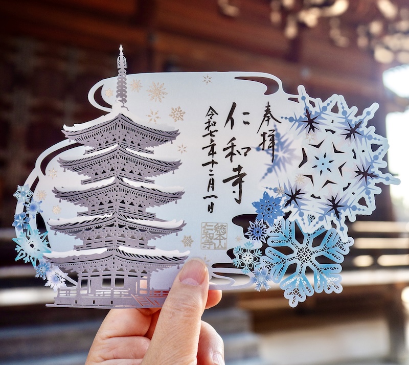冬の静寂に包まれた五重塔を、澄んだ銀世界とともに描いた切り絵御朱印です。
