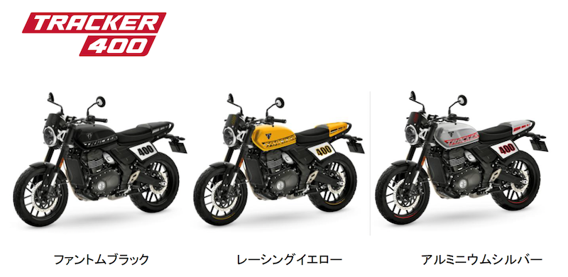 Tracker 400は、ロード上でも確かな存在感を放つフラットトラック・スピリットを体現する1台です。カラーは レーシングイエロー、ファントムブラック、アルミニウムシルバー の3色展開。