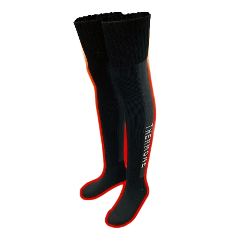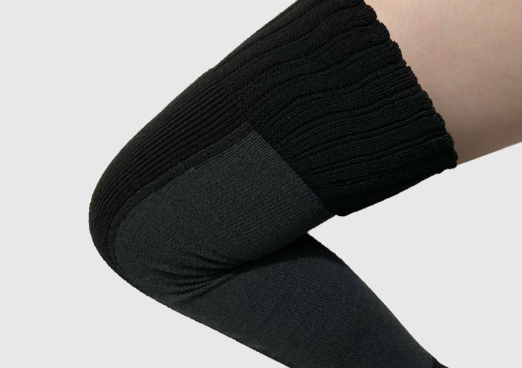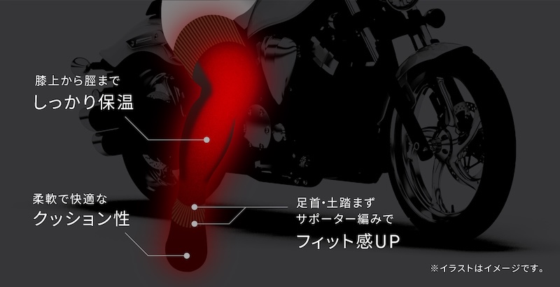冬のオートバイ乗車時など、走行風で特に冷えやすい「足先」「すね」「ひざ」までしっかりと温めます。全体に伸びのある編み立てで、太もも部分は特に柔らかくフィットします。締めつけ感を抑えつつ、レッグウォーマーや膝ウォーマーがいらないほど、1足でしっかり冷えを防げるのも特長です。