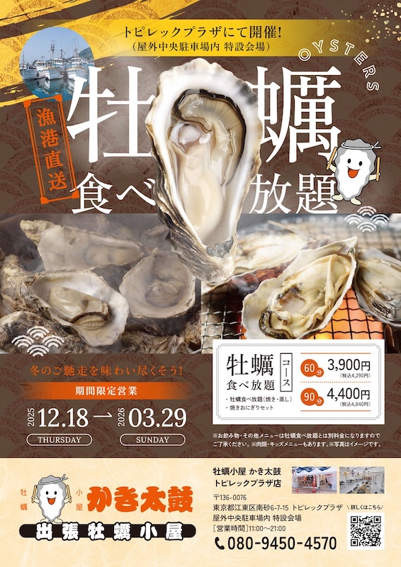 全国各地から産地直送された新鮮な牡蠣を心ゆくまで堪能できる「牡蠣小屋 かき太鼓」が2025年12月18日(木)トピレックプラザ駐車場内に冬季限定でNEW OPEN!