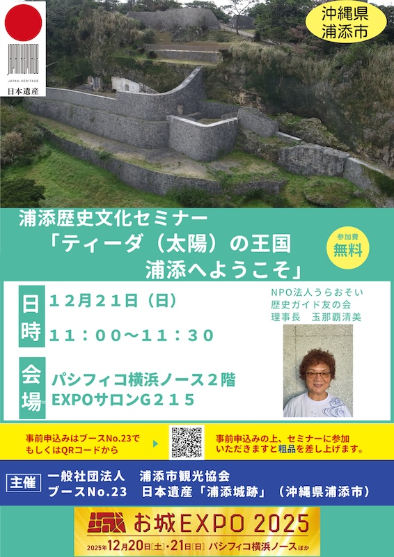 一般社団法人 浦添市観光協会(沖縄県浦添市)は、2025年12月20日(土)、21日(日)にパシフィコ横浜ノースで開催される「お城EXPO2025」に、日本遺産「浦添城跡」として4年連続で出展いたします 。会場では、沖縄の世界遺産登録25周年 を記念し、首里城・中城城など6つのグスクが合同で制作した「沖縄グスク巡り御城印」を一般販売(12月24日)に先駆け先行販売します。6枚を横に並べるとデザインがつながる完全連結のスペシャル仕様 で、相互誘客の促進 を目指します。また、歴史セミナー「ティーダ(太陽)の王国浦添へようこそ」 も開催します。