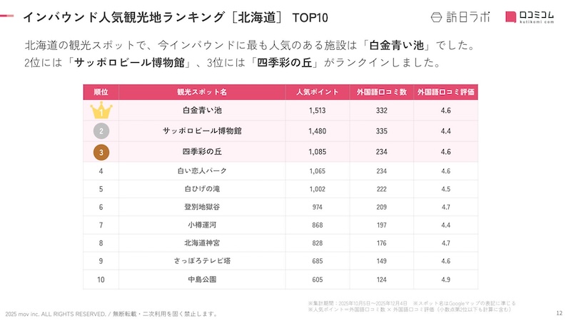 業界最大級のインバウンドビジネスメディア「訪日ラボ」及び 店舗向け集客一元化プラットフォーム「口コミコム」を運営する株式会社movは、北海道の観光地に寄せられた最新の口コミデータから、独自の『インバウンド人気観光地ランキング』を発表しました。