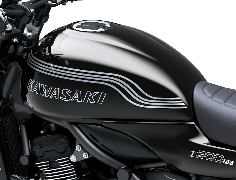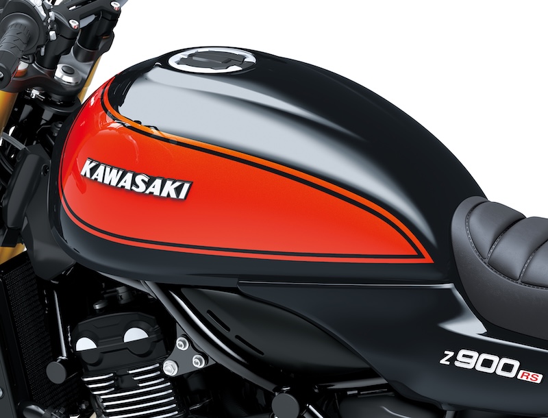 ・タンクのKAWASAKIロゴは、スタンダードモデルの立体エンブレムとは異なり、Z900RS CAFEのイメージに合わせて滑らかな転写フィルムで表現