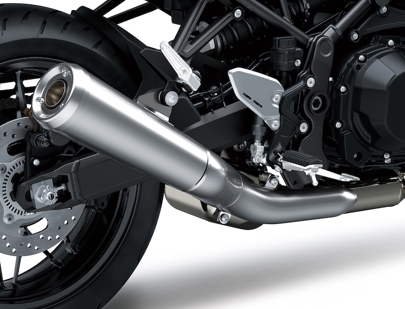 燃料タンクには、カワサキの伝説的モデル「マッハシリーズ」へのオマージュとしてレインボーラインのグラフィックを採用。KAWASAKIロゴは転写フィルムで表現され、下地のボディカラーが透けることで独自の存在感を放ちます。サイドカバーのエンブレムもブラック仕上げとし、全体の統一感を高めています。
