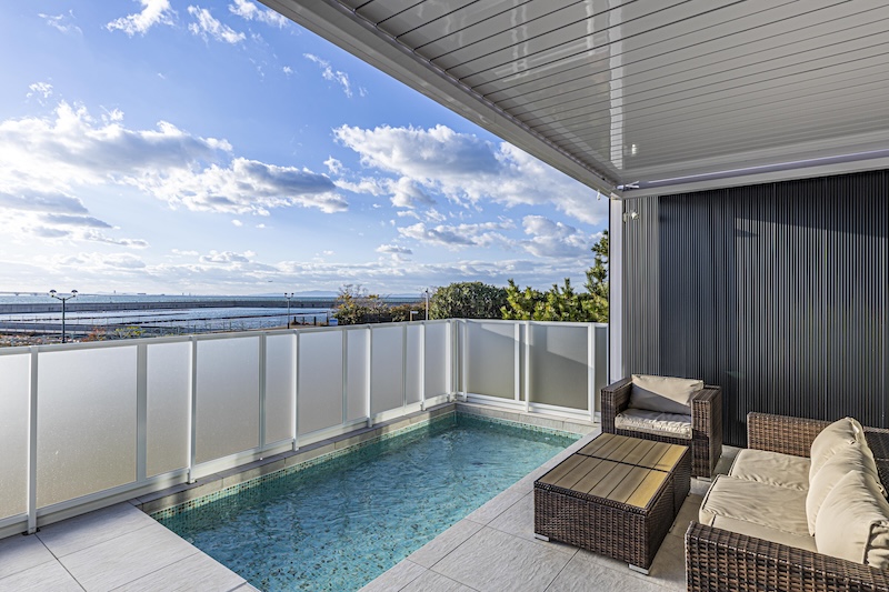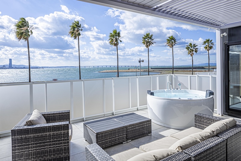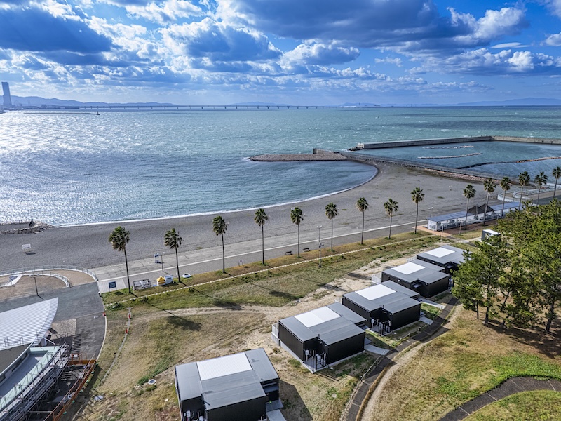大阪市内から車で約40分。二色の浜公園内に位置する「うみテラス二色の浜」は、全8室すべての客室から美しい海と夕陽を眺められる、“関西屈指の絶景ロケーション”が魅力のラグジュアリーグランピング施設です。