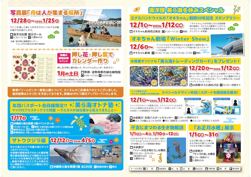 そのほか、美ら海花まつりや美ら海オトナ塾、お正月イベントなど、楽しいイベントが盛りだくさん!この機会にぜひ、家族みんなで海洋博公園にお越しください!