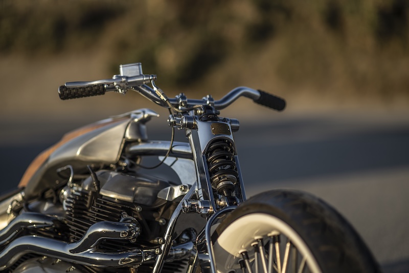 そのエンジンはゼロから製作したオリジナルフレームに搭載しました。独自に設計したクラシカルなガーダーフォークに、26インチというモダンな大径ホイールをセット。モダンとクラシックの融合を果たしています。外装にはマホガニー材を使用。それとリンクする外装類は塗装を廃し、アルミの地肌と木目が美しくリンクしています。