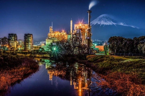 工場の南側の新滝川橋からは、滝川の川面に映る逆さ富士と逆さ工場夜景が撮影できます。工場では、身近な段ボールやお菓子箱の原紙を生産しています。