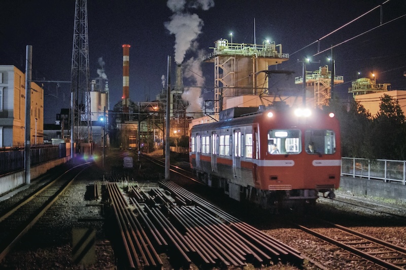 岳南原田駅からは、線路が工場・煙突に吸い込まれるようなアングルが楽しめます。工場夜景と電車を一緒に見ることができるスポットとして人気。原田駅から比奈駅方面に向かう電車内から眺める工場夜景も見どころです。