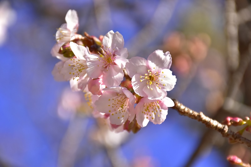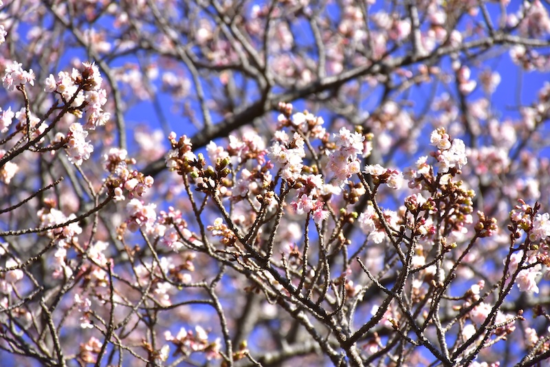 今シーズンは、寒波と比較的暖かい陽気が交互に訪れたためか例年より開花が早く、現在、全体としては3~4分ほど、一部の桜は既に5分以上に近い状態になっているものもあり、見頃を迎えております。今後は、気温の推移にもよりますが、1月下旬頃までお楽しみいただけそうです。