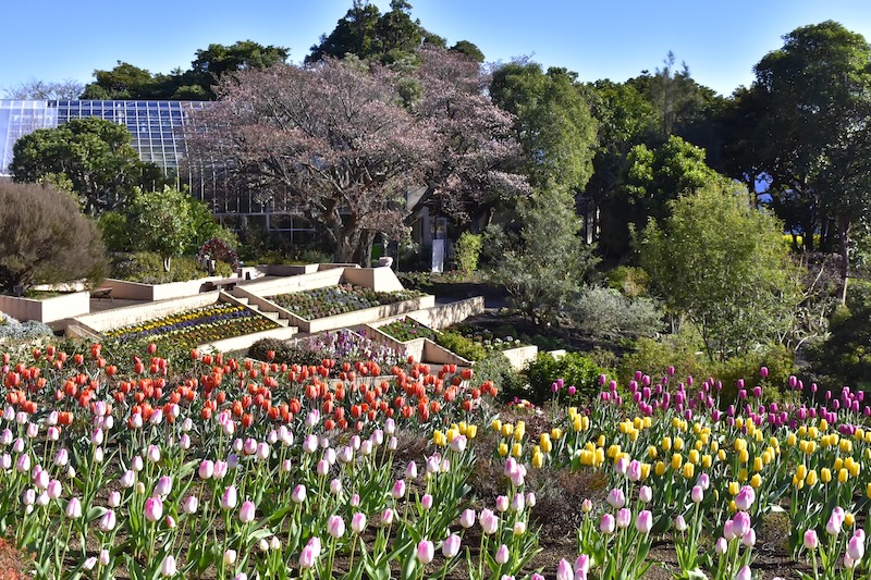 また園内では、カラフルなアイスチューリップをはじめ、キダチアロエのとんがり帽子のような赤い花や、一面の菜の花が競うように咲き誇っております。