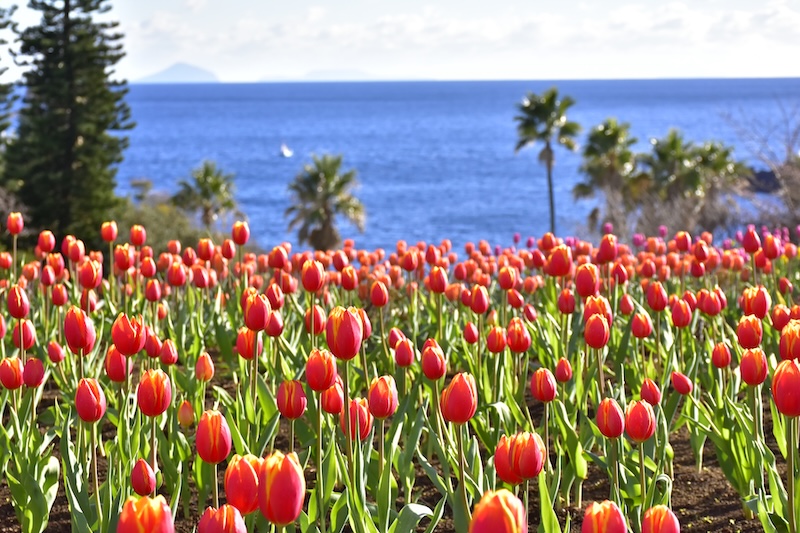城ヶ崎海岸や伊豆大島を望む風光明媚な花畑が青い空と海に映え、ひと足早く春の訪れを楽しむことができます。