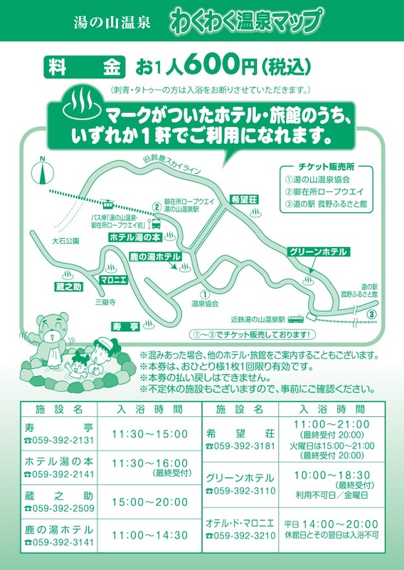 「わくわく温泉チケット」は、湯の山温泉エリアにある7つの宿泊施設のうち、いずれか1施設で利用できる日帰り入浴券です。料金は1枚600円(税込み)と気軽に名湯を楽しめる価格となっています。