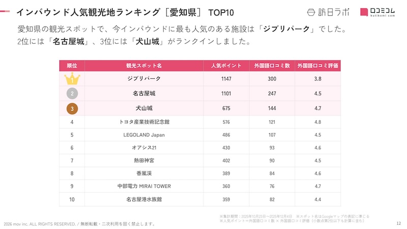 業界最大級のインバウンドビジネスメディア「訪日ラボ」及び 店舗向け集客一元化プラットフォーム「口コミコム」を運営する株式会社movは、愛知県の観光地に寄せられた最新の口コミデータから、独自の『インバウンド人気観光地ランキング』を発表しました。