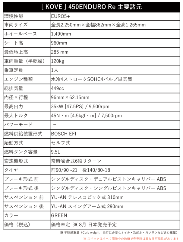 KOVE JAPANでは「120kg! 47.5PS! 公道オフ車 最強スペック」の 450 ENDURO Re を8月に日本発売予定です。詳細は下記製品ページをご参照ください。