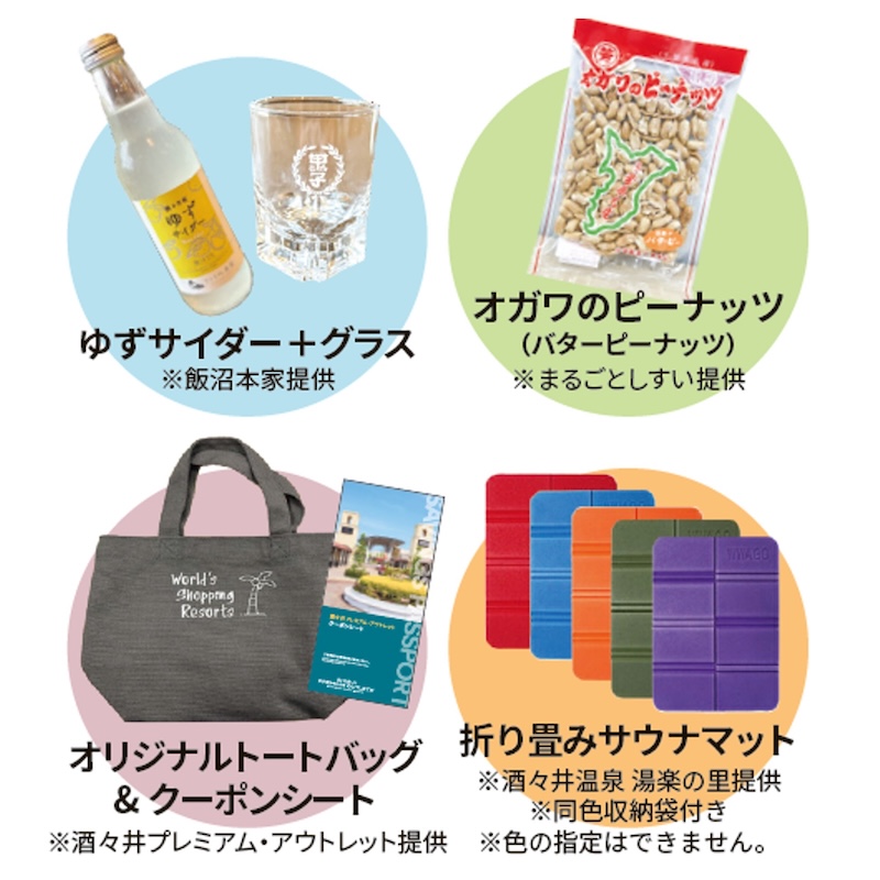 本スタンプラリーは、酒々井町の魅力を発信し、町内の観光・周遊を促進するために4施設が連携して企画したもので、2020年に初開催し、今回で4回目の開催となります。対象施設でのお買い物やご利用で、スタンプラリーの台紙に押印します。スタンプを2つ集めた方にはオリジナルステッカーをプレゼント、3つ集めると各施設のノベルティなどを集めたセットをプレゼント。そして4つ全て集めた方には、さらに豪華な賞品セットとして、「飯沼本家」による「ゆずサイダー」とグラスのセットや、「まるごとしすい」からは酒々井町産のピーナッツを使った「バターピーナッツ」、「酒々井温泉 湯楽の里」からはサウナマット、「酒々井プレミアム・アウトレット」の対象店舗で特典が受けられるクーポンシートなど魅力たっぷりの詰め合わせをプレゼントします。