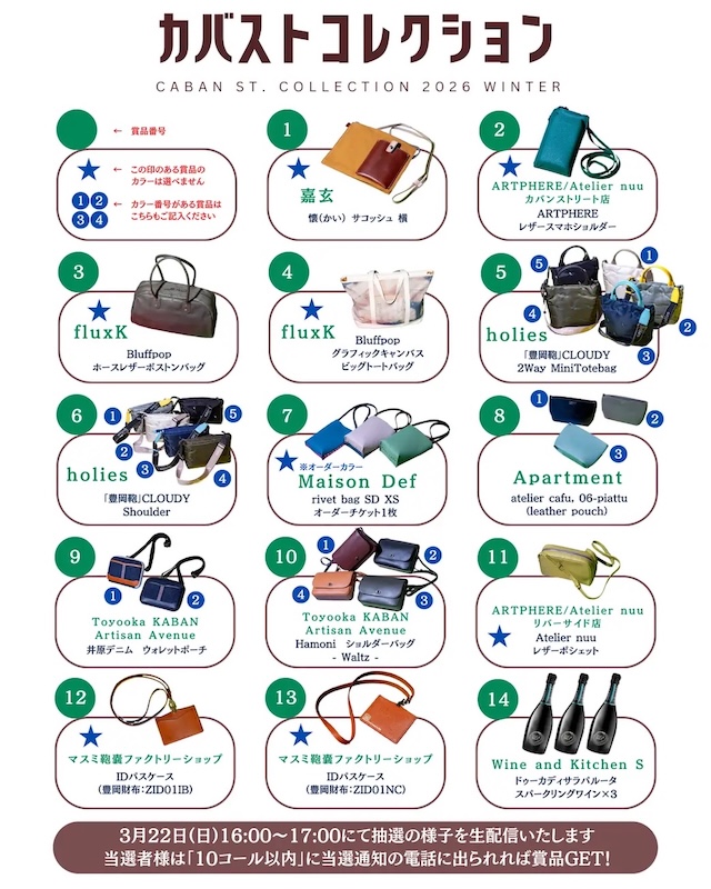豊岡まちづくり株式会社および、同社と周辺店舗によるイベント協議会「豊岡まちなかイベント企画」は、国内有数の鞄産地である兵庫県豊岡市の中心部の通称「カバンストリート」周辺の活性化をめざしたスタンプラリーイベント「カバストコレクション」を2026年1月10日から開催します。詳細は、豊岡まちづくり株式会社が運営する施設「Toyooka KABAN Artisan Avenue ホームページ」にてご覧いただけます。