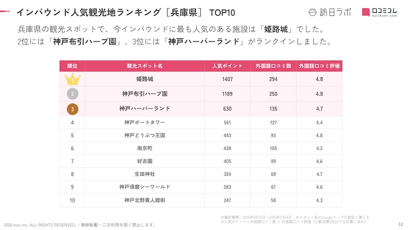 業界最大級のインバウンドビジネスメディア「訪日ラボ」及び 店舗向け集客一元化プラットフォーム「口コミコム」を運営する株式会社movは、兵庫県の観光地に寄せられた最新の口コミデータから、独自の『インバウンド人気観光地ランキング』を発表しました。