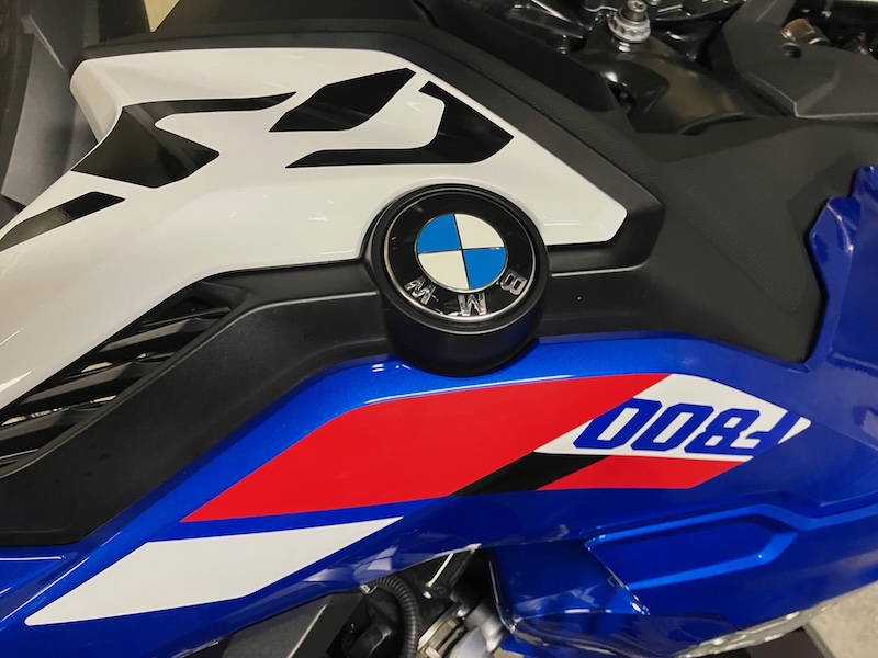 F750GSからF800GSへとアップグレードし、F900GSとともにBMWのGSシリーズの中核を成すF800GS。F900GSがスポークホイールでフロント21インチ、リア17インチのオフロード寄りのエンデューロバイクなのに対して、F800GSはフロント19インチ、リア17インチのキャストホイールでオンロードバイクとなっており、F900GSとそのキャラクターが分かれています。なお、フロントは倒立サスペンションです。またリアはローシート仕様には電サスのダイナミックESAはついていません。(撮影車両にはオプションのBMW純正ナビゲーションが付いています)。