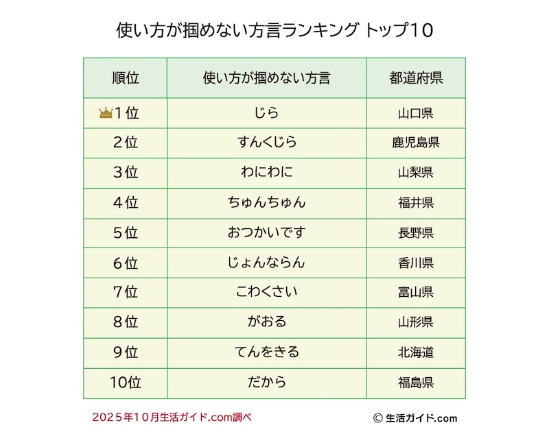 株式会社ウェイブダッシュが運営する、みんなでつくる地域応援サイト「生活ガイド.com」(https://www.seikatsu-guide.com/) は、みんなのランキング第54回「使い方が掴めない方言ランキング」のトップ10を発表いたしました。