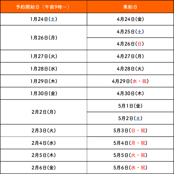 乗船予約は1月下旬より順次受付開始いたします。皆さまのご乗船を、心よりお待ちしております。