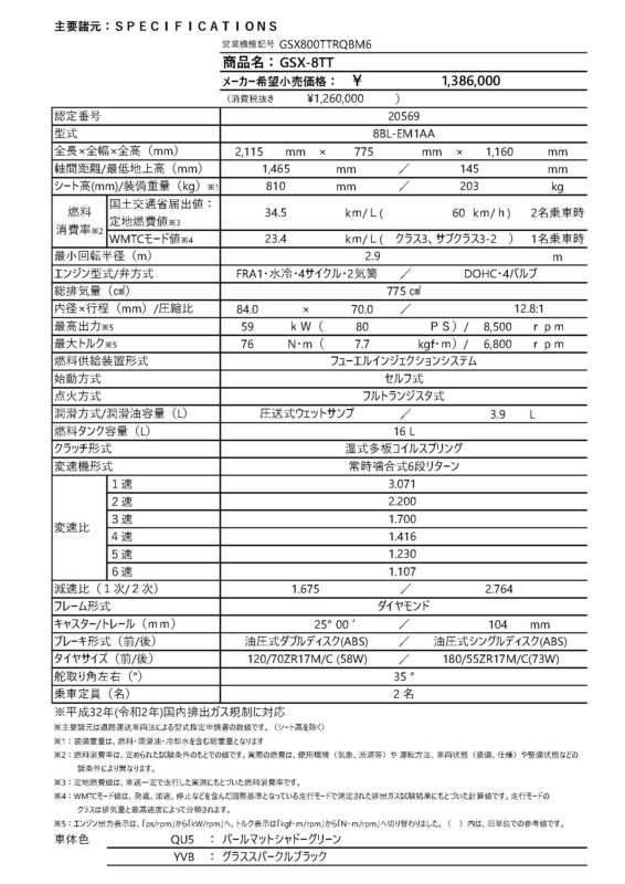 - 新型「GSX-8TT」 (4サイクル 775cm3):1,386,000円