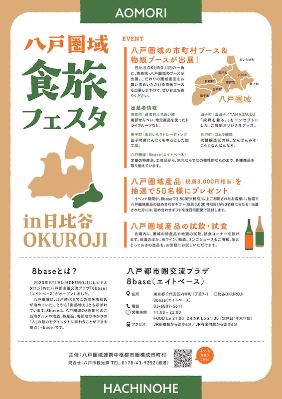 今回、「八戸圏域」のアンテナショップである「八戸都市圏交流プラザ『8base』」と「8base」が入居する「日比谷OKUROJI」において、八戸圏域をPRするイベント「八戸圏域食旅フェスタ」を開催します。