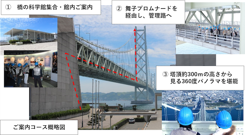 橋を支える最先端技術の数々を、建設に携わったエキスパート等のガイドとともに体感でき、普段は立ち入ることのできない管理路や塔頂への特別なツアーで、非日常の感動と学びをお届けします。