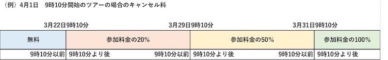 | ツアー参加日時の3日前の9時10分より後から前日の9時10分まで | 参加料金の50% |