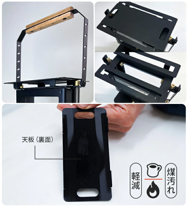 どうしても火を扱うので煤が少し発生します。ただ天板があるので、煤が調理器具につきにくくなります。天板裏には煤がつきますが、調理器具にはつきにくく、お手入れが簡単です。
