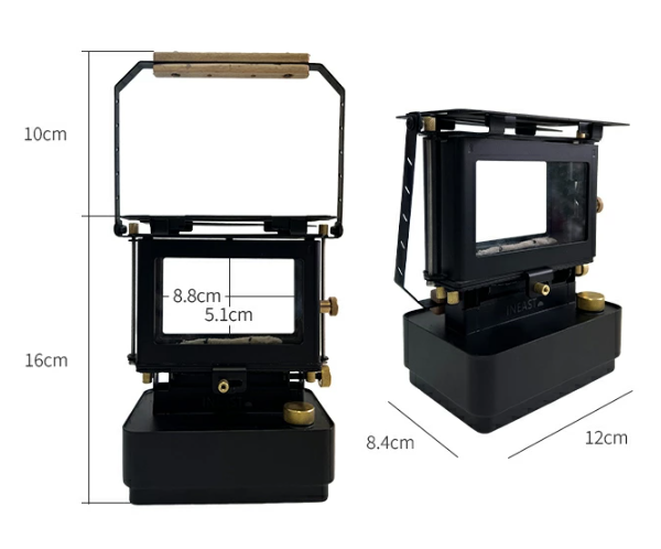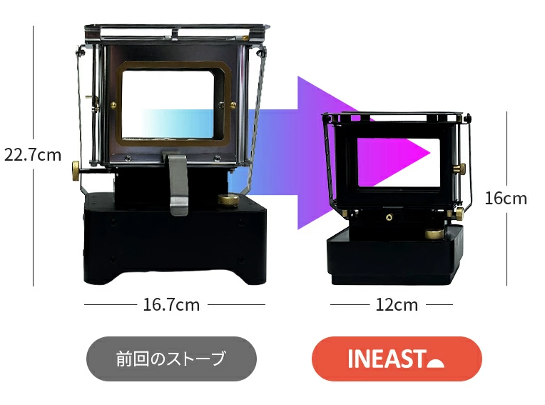 高さ16cm、重さ860gの軽量コンパクトなミニアイロンストーブ!今までより小さくなったけど、窓は大きく、しっかりとしたアイロンストーブです