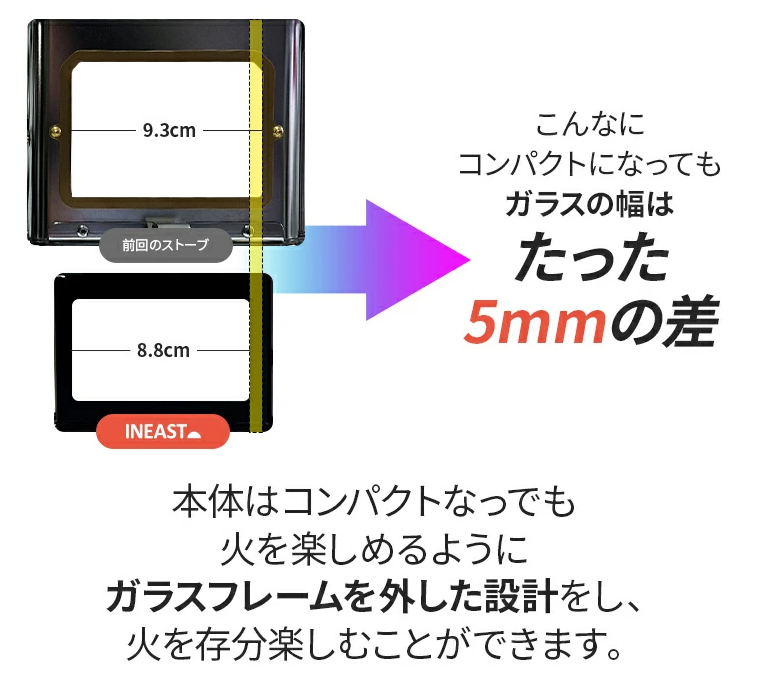 せっかく火を見て楽しむアイテムなので、全体的なサイズは小さくなりましたが、ガラス窓は少しだけ小さくなっただけで、ほとんど従来と変わらないガラス窓設計!これなら火もしっかり楽しめます。