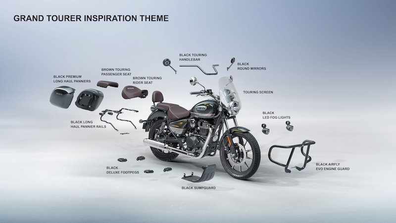 2026年モデルのMETEOR 350には、各バリエーションの個性を引き立てる純正アクセサリー「Royal Enfield Accessories」も用意しました。アクセサリーは2つのテーマで構成しました。「Urban Kit(アーバン・キット)」にはブラックのドラッグハンドルバーにブラックのバーエンドミラー、ローライダーダーシート、スモーク・フライスクリーンなどを装備。一方の「Grand Tourer Kit(グランド・ツアラー・キット)」には、ブラウンのツーリングシート、ブラックのプレミアムパニアとパニアレール、デラックスフットペグ、ブラックのツーリングハンドルバー、LEDフォグランプなどを含み、より本格的なツーリング仕様を実現します。